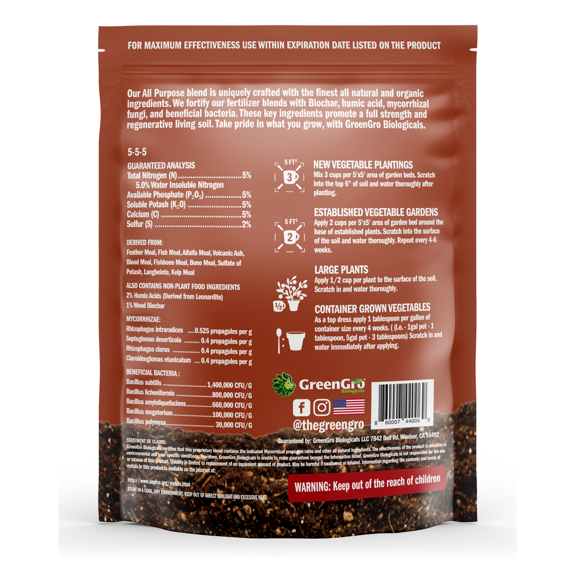 Does your garden need a boost? This all purpose fertilizer can be used on any kind of plant, enriching the soil with everything it needs to nurture your vegetables, flowers, shrubs, trees or container plants. Containing our signature biochar, mycorrhizae and beneficial bacteria blend, this general fertilizer helps promote regenerative living soil, which allows it to support you in growing healthy plants with less work. Use when planting or every 4-6 weeks in garden beds, or every 2-4 weeks in container plants, and water well after application.