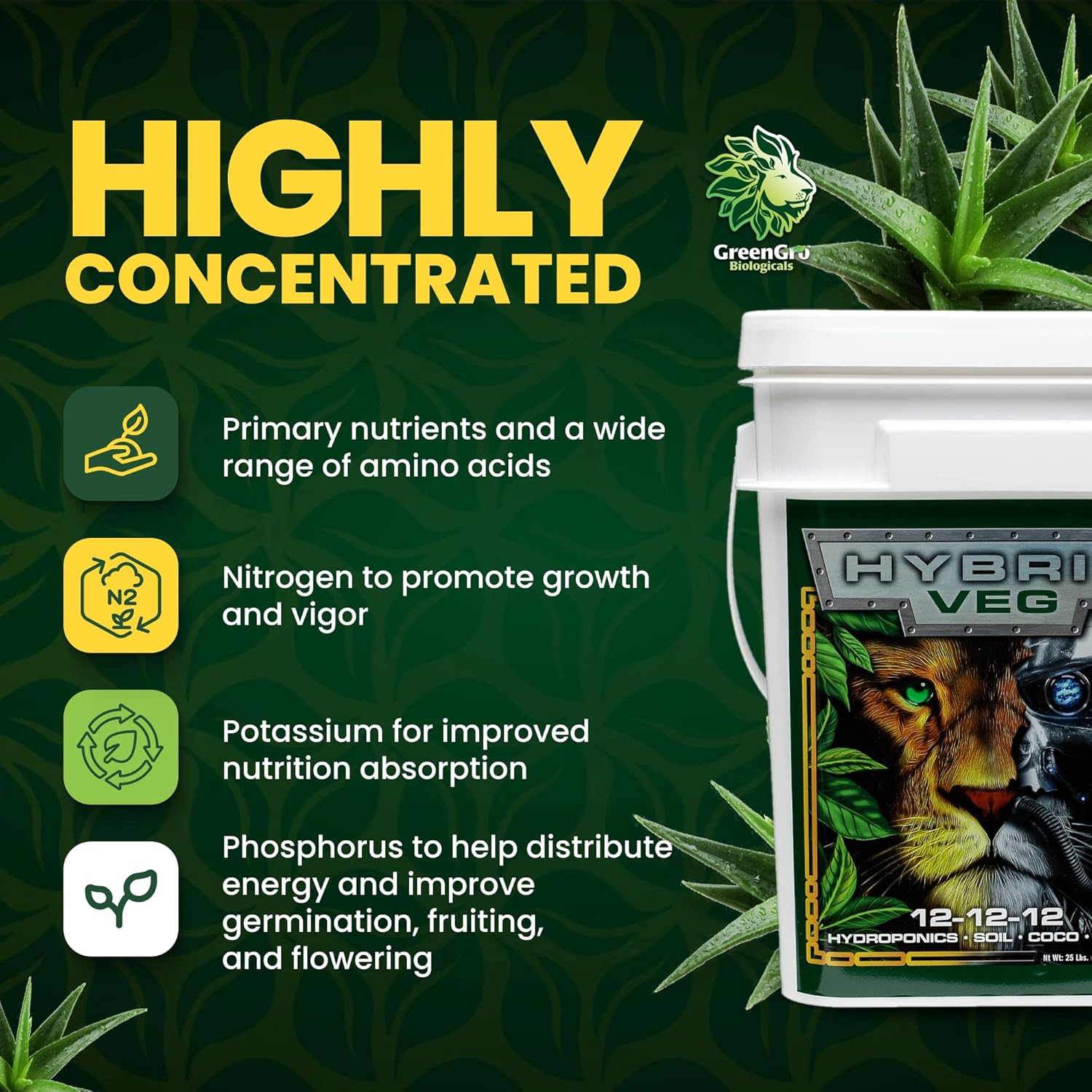 Hoping to set up your hydroponic garden for success? Start with GreenGro Hybrid Veg in your feeding tank and throughout the vegetative cycle as a foliar feed. Hybrid Veg is an all-purpose fertilizer designed for use in hydroponic gardens during the vegetative growth stage that supports lush foliage and healthy plant growth. Can be used as a root drench or foliar spray every 7-10 days, but not advisable to use during times of stress. Enjoy hydro growing with less stress thanks to Hybrid Veg.