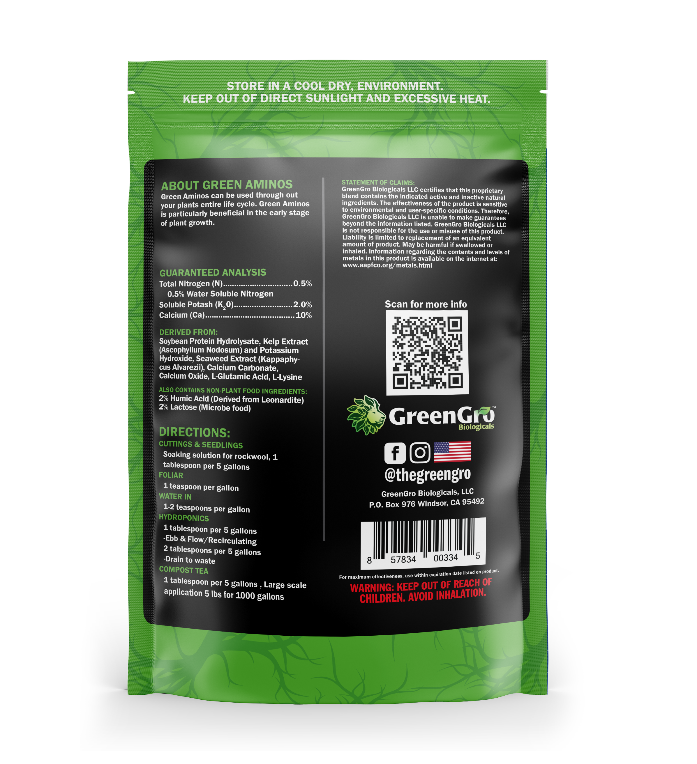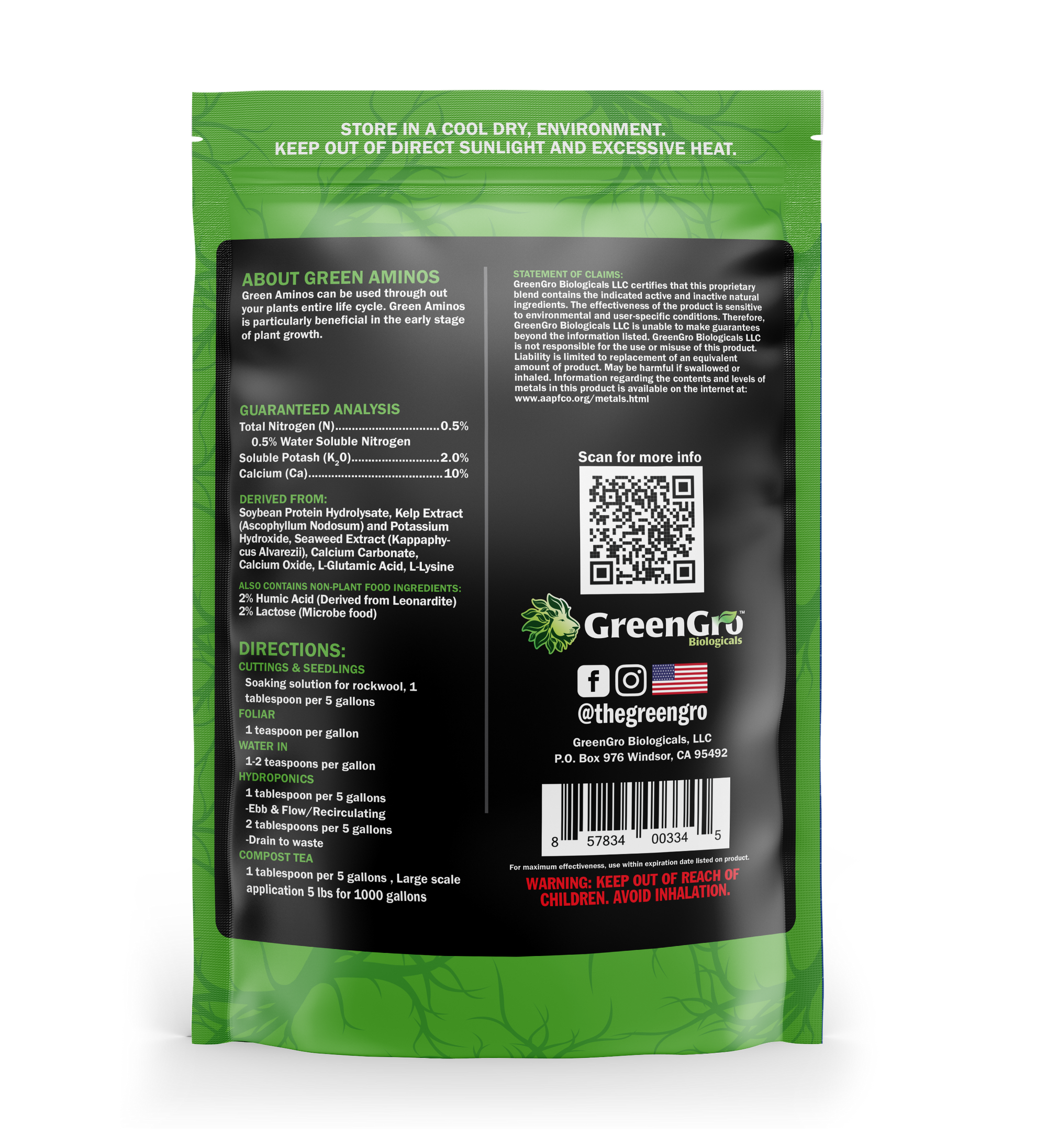 Want to maximize the effectiveness of your nutrients and your plants' absorption abilities right from the start? GreenGro Green Aminos provides an essential blend of amino acids that support strong roots and plant growth throughout the life cycle. Whether you use Green Aminos in a rooting solution, watered into soil or as a foliar feed, you can be assured your plants are receiving optimal nutrition from premium natural ingredients. Give your garden the head start it needs with Green Aminos.