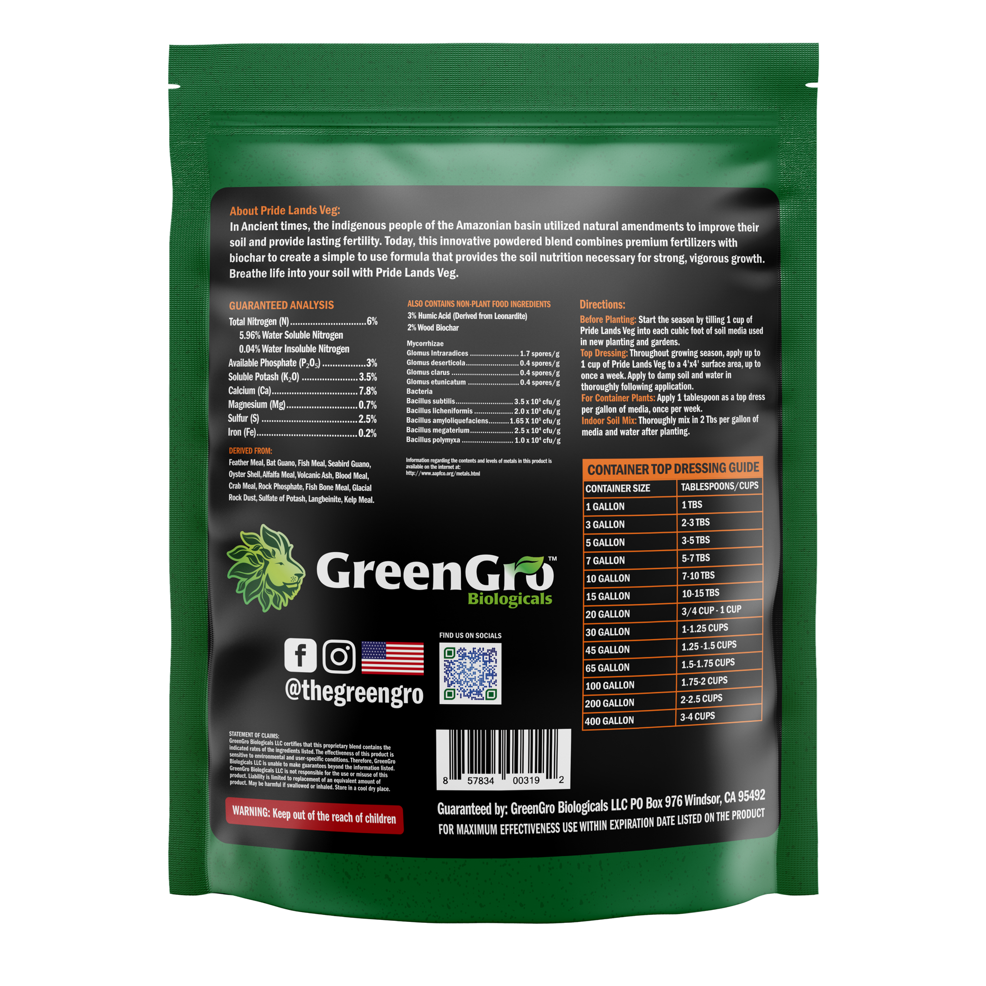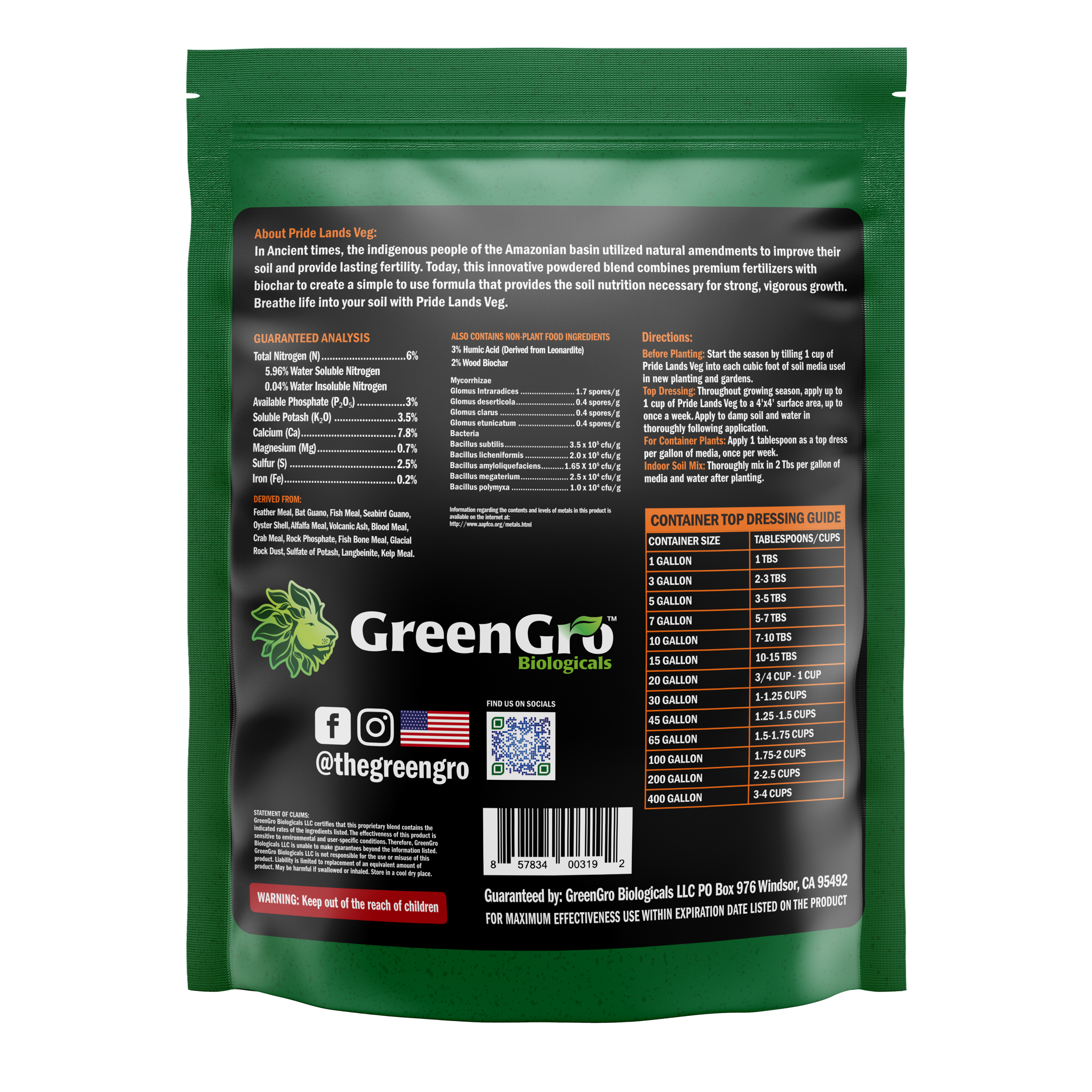Want your set your plants up for healthy vigorous growth? Start with Pride Lands Veg formula, designed to give plants everything they need for a healthy vegetative growth stage. Using ancient secrets from the Terra Preta soils that nurture the mighty Amazon rainforest combined with modern innovations in plant science, this powdered blend combines premium all-natural fertilizers with the potent power of biochar. When mixed into your soil, this blend provides all the nutrients essential for vigorous plant growth. Give your garden the strong start it deserves by adding Pride Lands Veg to your soil when planting and throughout the growing season.